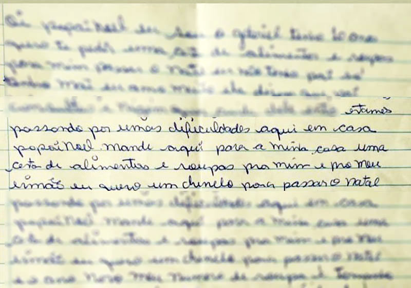 “Estamos passando por umas dificuldades aqui em casa, Papai Noel. Mande aqui pra minha casa uma cesta de alimentos e roupas pra mim e pro meu irmão…. e um chinelo para passar o Natal e o Ano Novo”, escreveu Gabriel de 10 anos, de Peruíbe, litoral de São Paulo.